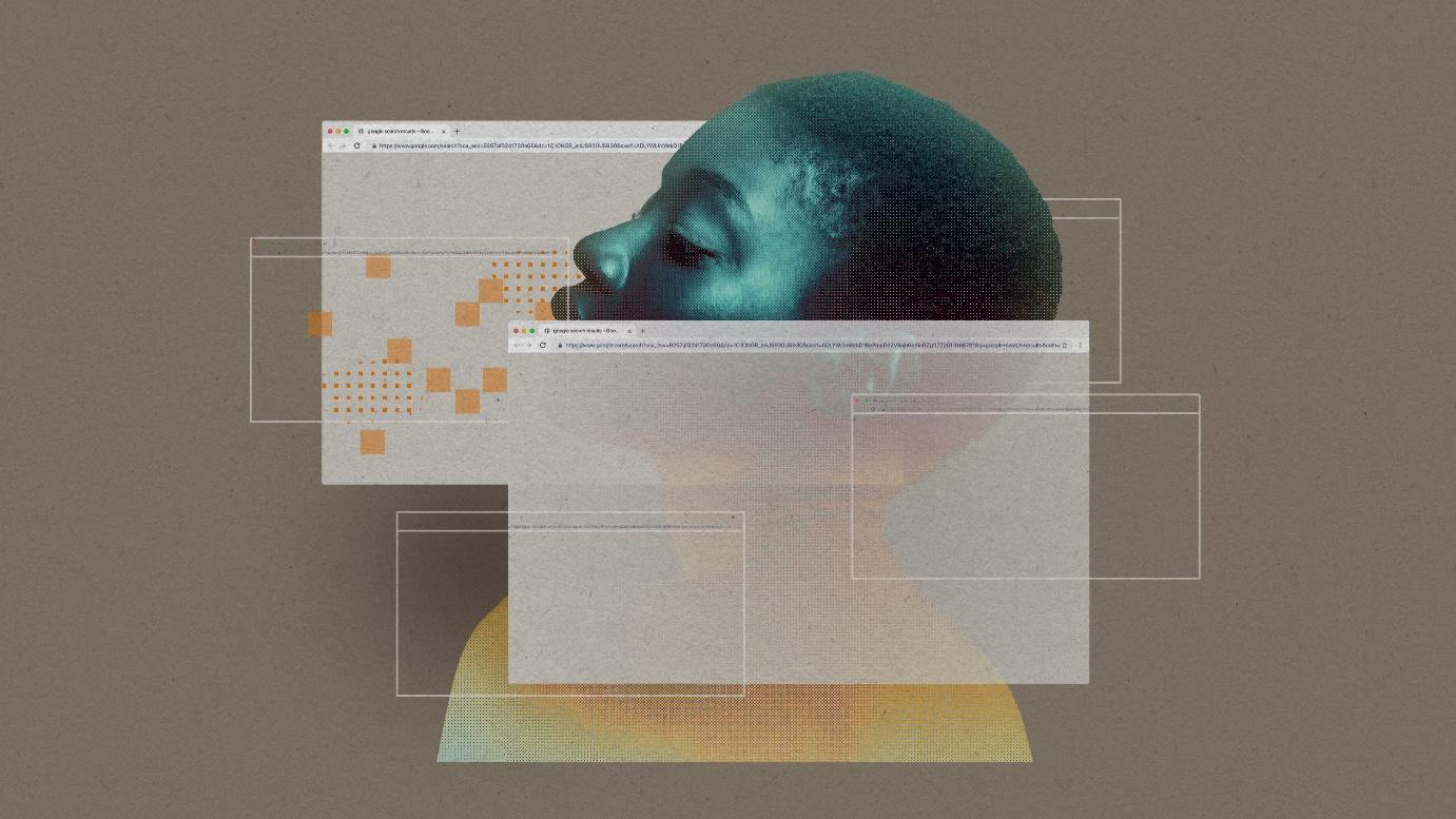 BUST OF A PERSON MASKED PARTIALLY BY BROWSER WINDOWS