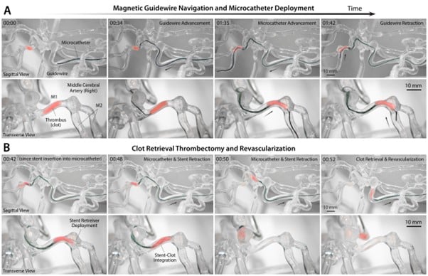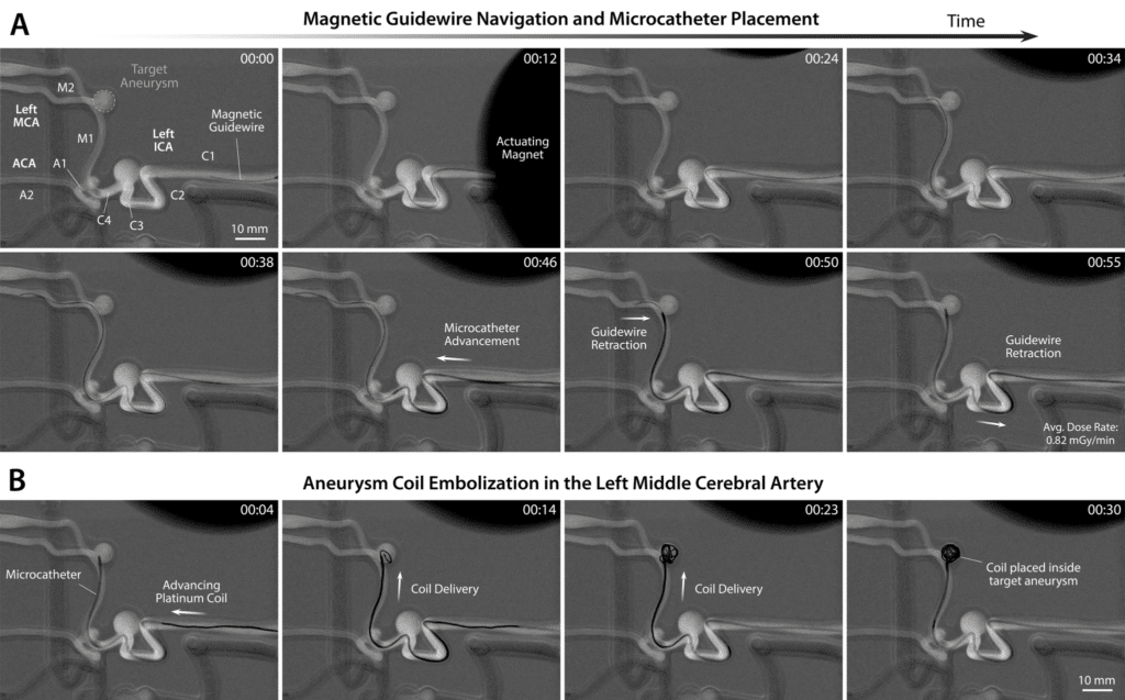 뇌혈관 이상으로 인하여 뇌조직에 혈류 공급이 어려워질 때 발생하는 뇌졸중(stroke) 환자들이 매년 전 세계적으로 1,500만 여명씩 새로 생겨나고 있다. MIT 테크놀로지 리뷰 ‘35세 이하 혁신가(IU35)’로 선정된 김윤호 박사(MIT PhD)는 뇌졸중 치료에 사용되는 원격 조종 로봇 시스템을 개발했다. 자기장으로 제어되는 와이어 형태의 이 의료용 소프트(연성) 로봇은 안전성과 정확성을 크게 개선해 뇌졸중과 동맥류 치료에 혁신을 가져올 전망이다. 숙련된 의사는 뇌졸중 환자의 막힌 뇌혈관을 뚫기 위해서 보통 ‘가이드 와이어(guide wire)’를 사용하는데, 좁고 복잡한 뇌혈관 조직 속에서 수동으로 강선을 조작하는 이 방식은 혈관 조직에 손상을 줄 수 있다. 그러나 김 박사가 새로 개발한 소프트 로봇 시스템은 이러한 문제를 해결하는 돌파구를 열어줄 것으로 기대된다.