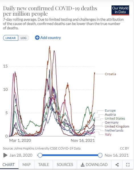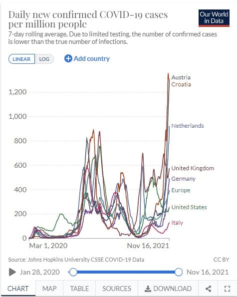 유럽 대부분의 지역에서 이와 비슷한 상황이 펼쳐지고 있다. 로이터 통신에 따르면 현재 전 세계 코로나 신규 확진자의 절반 이상이 유럽에서 나오고 있다. 이는 2020년 4월 이후 가장 높은 비율이다. 인구 400만의 크로아티아에서는 현재 봄철 대유행 때보다 많은 확진자와 사망자가 출현 중이다. 하루 평균 사망자 수는 55명으로, 1년 전 이맘때에 나온 사망자 수를 상회한다. 유럽 많은 지역 상황도 이와 별반 다르지 않다. 그렇다면 지금 유럽에서 도대체 무슨 일이 일어나고 있는 것일까?