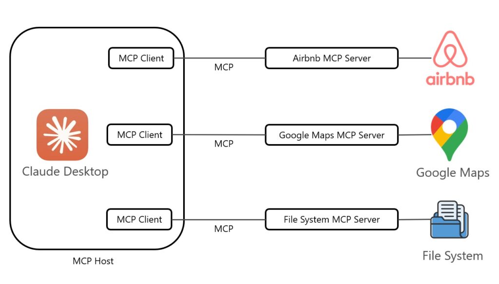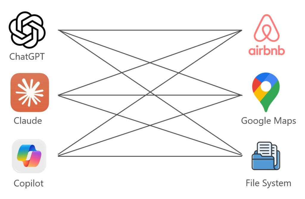 그런데 각각의 AI 채팅 서비스들이 서로 다른 장단점을 갖고 있어, 만약 사용자가 챗GPT 뿐만 클로드(Claude)나 제미나이(Gemini)와의 연동까지 고려하거나, 공항에서 예약한 숙소까지의 거리와 예상 소요 시간을 확인하기 위해서 구글 맵(Google Maps) API와도 연동하려 한다면 그때마다 연동 작업을 반복해야 한다.