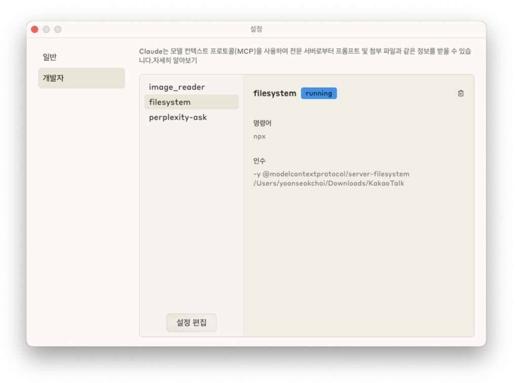 <그림 5>에서 보듯 필자는 다음에 설명할 간단한 테스트 시나리오를 위해 로컬 파일 시스템을 액세스할 filesystem, 파일 시스템에서 이미지 파일을 읽어들일 image_reader, AI 기반 검색엔진 퍼플렉시티(Perplexity)를 위한 perplexity-ask 등 3개의 MCP Server를 ‘claude_desktop_config.json’ 파일에 각각 설정 후 연결했다. 아직은 MCP가 초기 단계에 있어 설정 과정에서 특정 파일을 에디터로 열어 문법에 맞게 직접 수정하는 등 불편한 작업이 필요하다(이러한 부분도 향후 사용자 친화적인 방식으로 개선될 것으로 보인다).