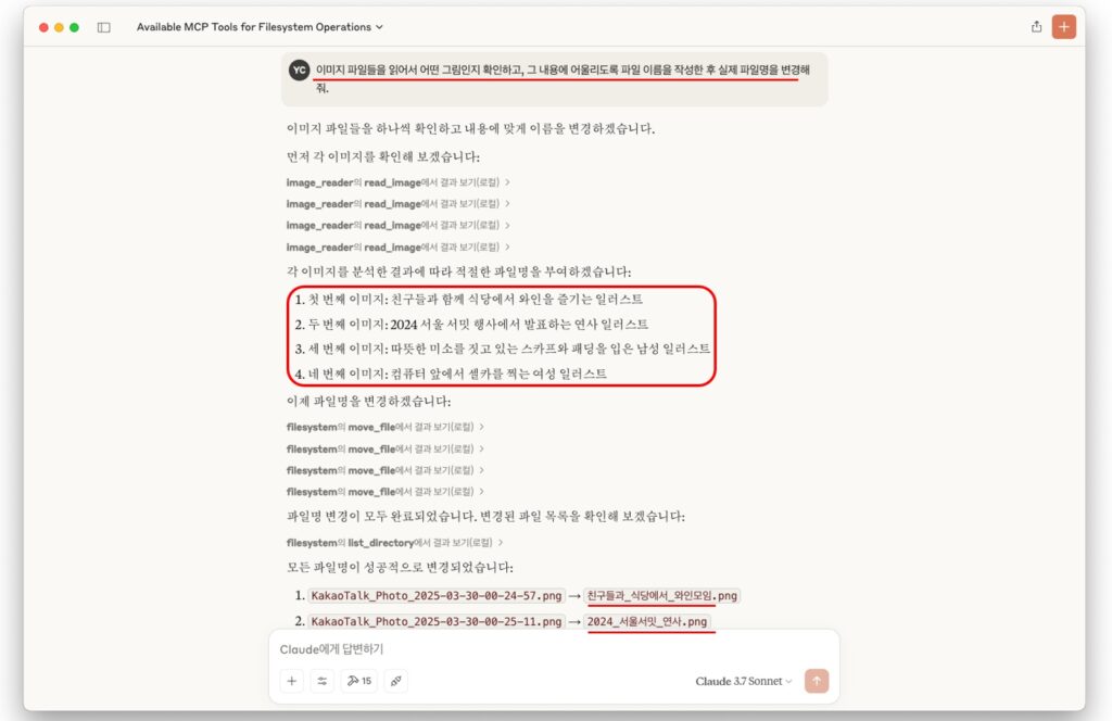 또한 <그림 7>은 필자의 맥(Mac) 장비의 로컬 파일 시스템을 액세스할 수 있는 File system MCP Server와 이미지 파일을 읽는 Image Reader MCP Server를 설정하여, 특정 폴더 내의 이미지 파일을 읽고, 이미지의 내용을 간략히 글로 설명하도록 설정한 결과다. 이제 일련번호로 생성된 파일명으로 인해 직접 이미지 파일을 열기 전까지는 어떤 이미지인지 알 수 없었던 것을 내용을 쉽게 파악할 수 있는 직관적인 파일명으로 자동 변경하도록 작업을 수행했다.