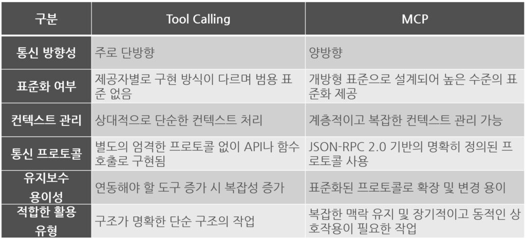 지금까지 MCP가 AI 시스템의 외부 도구 및 데이터 소스와의 연동 과정에 존재했던 여러가지 제약과 비효율성을 빠르게 개선하고 있다는 점을 설명했다. 이를 좀 더 명확하게 정리하면 <표 1>과 같다.