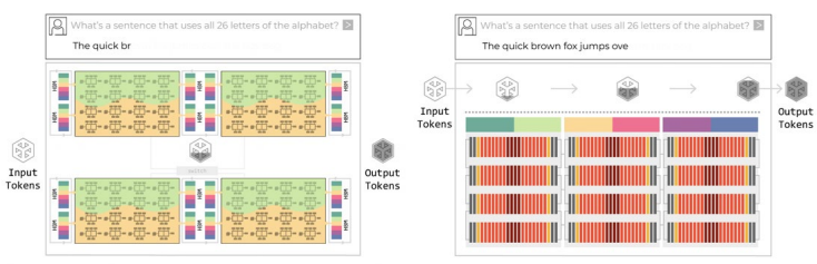 GPU의 ‘허브 앤 스포크’ 접근 방식(왼쪽)보다 훨씬 빠르고 효율적인 그록 LPU의 프로그래머블 어셈블리 라인 아키텍처(오른쪽) (출처: 그록 LPU 블로그)