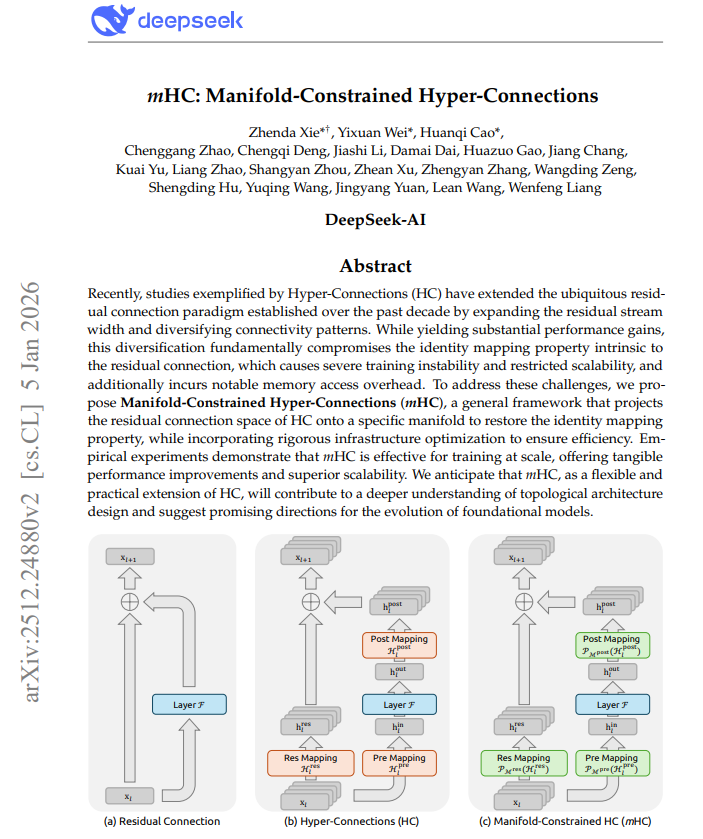 그 핵심에는 지난해 화제를 일으켰던 ‘다중 헤드 잠재 어텐션(MLA)’을 넘어, 1월 5일 게재한 논문 <mHC: Manifold-Constrained Hyper-Connections>을 통해 구체화된 mHC 계열 추론 아키텍처가 있다. 이는 하나의 정답을 얻기 위해 모든 정보를 단일 경로로 밀어 넣는 방식이 아니라, 여러 추론 가설을 병렬로 생성하고, 이후 선택·집계·가지치기를 통해 최적의 경로만 남기는 구조다. 한 명의 슈퍼 전문가에게 모든 결정을 맡기는 대신, 여러 전문가의 초안을 빠르게 만들어 그중 가장 합리적인 판단을 채택하는 방식에 가깝다.