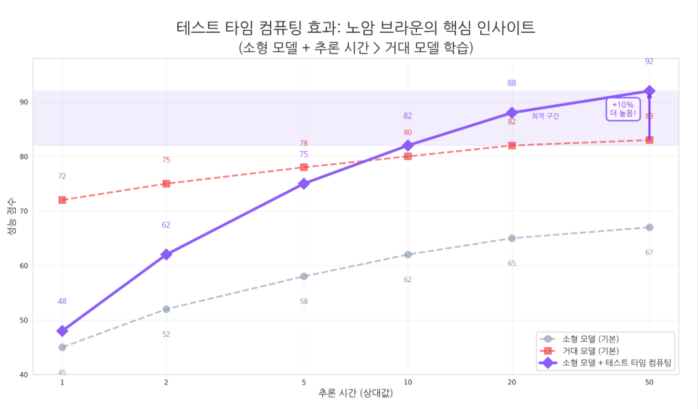 브라운의 설계에서 또 하나 중요한 개념이 있다. 바로 테스트 타임 컴퓨팅(Test-time Computing)이다.