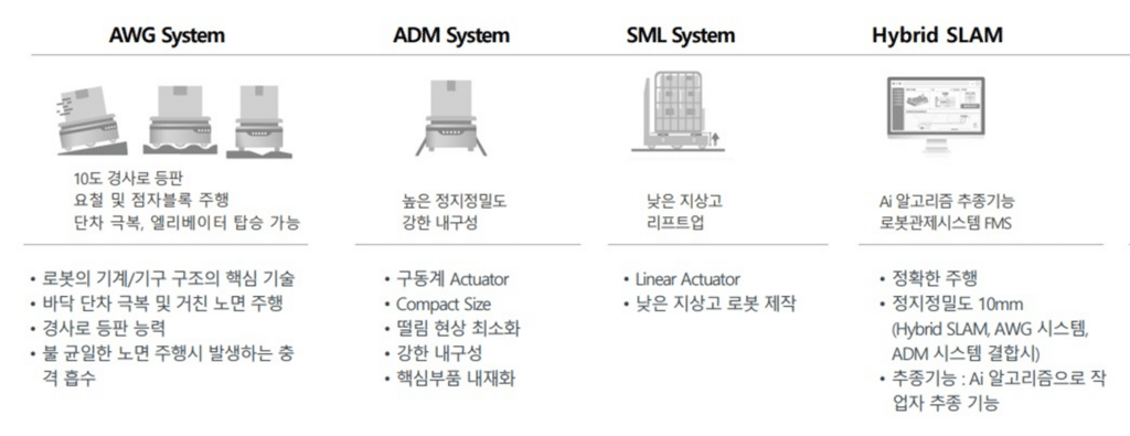 AGV는 운전자 없이 자동으로 돌아다니는 산업용 차량, 이송체(Vehicle)다. AMR 대비 비용이 저렴하며 QR코드나 자기 테이프 등을 통해 AGV 전용 경로를 설정, 좀 더 빠른 이동이 가능하고 물류 창고 등 물량이 많은 곳에서 활용도가 높다.