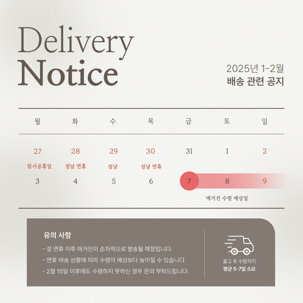 설 연휴로 인해 매거진 배송 일정이 변경되었습니다.