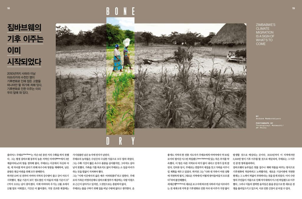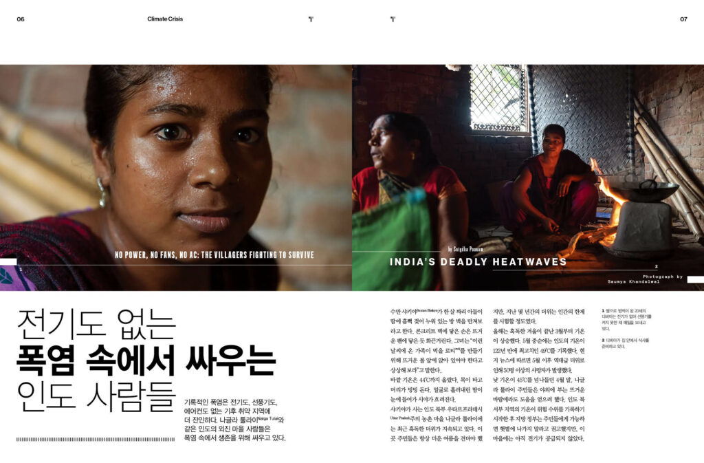 전기도 없는 폭염 속에서 싸우는 인도 사람들 - 6p 세계적인 폭염, 기후 변화가 더 빨라지고 있다는 징조일까? – 14p ‘건조제’가 에어컨을 바꿔놓을지도 모른다 – 16p 짐바브웨의 기후 이주는 이미 시작되었다 – 18p 기후 위기의 더 큰 재앙 피하려면 에너지 전환에 성공해야 한다 – 22p 올해 태양광 투자 규모, 사상 최초로 석유 투자 초월 전망 – 26p 기후재앙까지 인류에 남은 시간 3년에 불과하다 – 29p 유엔의 해운업 탄소중립 목표, 2050년까지 필요한 것은? – 32p 메타의 전 CTO, 해양 기반 탄소 제거에 나서다 – 34p 탄소 제거를 위한 해조류 양식의 허와 실 – 38p 산불을 견디는 주택 건설 – 40p 기후 문제를 해결할 슈퍼 트리 – 48p
