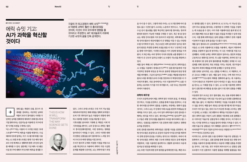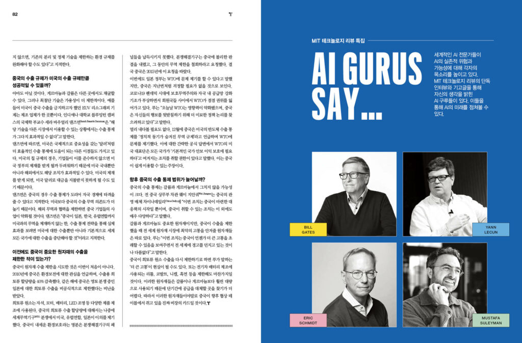 AI Gurus say … - 83p ‘실존적 위험’은 어떻게 AI의 가장 큰 화두가 되었나 – 84p 빌 게이츠: AI는 두렵지 않다 – 88p 얀 르쿤, 조엘 피노: AI에 대한 두려움은 과장되었다 – 90p 에릭 슈밋 기고: AI가 과학을 혁신할 것이다 – 92p 무스타파 술래이만 기고: 새로운 튜링 테스트가 필요하다 – 96p 세계 최초로 채택된 유럽연합 ‘AI법’에서 주목할 5가지 – 100p 질문하는 챗봇은 논리적 허점을 알아채는 데 도움을 줄 수 있다 – 102p 우리는 모두 AI의 무급 데이터 노동자다 – 104p AI로 생성한 콘텐츠, 프로그래매틱 광고 시장을 혼란하게 하다 – 107p 독점 공개: 생성형 AI는 영화를 어떻게 바꾸고 있는가 – 110p 구글 딥마인드의 게임용 AI, 더 빠른 정렬 알고리즘을 발견하다 – 114p