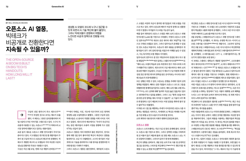 AI는 변호사를 대체할 수 있을까 – 63p 전문가들이 GPT–4를 활용하는 법 – 67p 구글과 경쟁중인 AI 언어 기반 번역 딥엘의 창업자를 만나다 – 70p 오픈소스 AI 열풍, 빅테크의 비공개 전환에도 지속될 수 있을까? – 72p AI 챗봇이 초래할 수 있는 ‘보안 위협’ 세 가지 – 77p ‘딥러닝의 아버지’ 제프리 힌턴이 자신이 만든 기술을 두려워하는 이유 – 80p