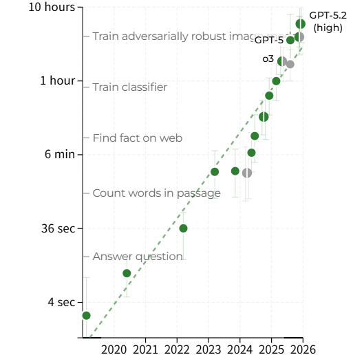이 같은 흐름은 앤트로픽의 최상위 모델인 ‘클로드 오퍼스 4.5(Claude Opus 4.5)’에서도 뚜렷하게 나타났다. 지난해 11월 말 공개된 이 모델에 대해 METR는 약 한 달 뒤 “인간이라면 약 5시간이 걸릴 작업을 오퍼스 4.5가 독립적으로 수행할 수 있는 것으로 보인다”고 평가했다. 이는 기존의 기하급수적 성장 곡선을 기준으로 예상했던 수준을 크게 웃도는 결과였다.