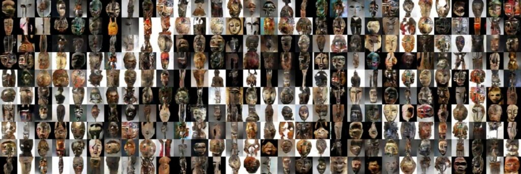 이 마스크 사진들은 인공지능이 만든 작품이다. 프랑스 파리의 예술공학단체 오비어스(Obvious)가 2020년 AI 시스템을 이용해 만든 ‘아프리칸 마스크(African mask)’다. 아프리카에서 제작된 마스크 이미지 9,300여점을 학습하여 새롭게 만들어낸 것이라 실제와 흡사할 뿐만 아니라 이미지 종류도 매우 다양하다.