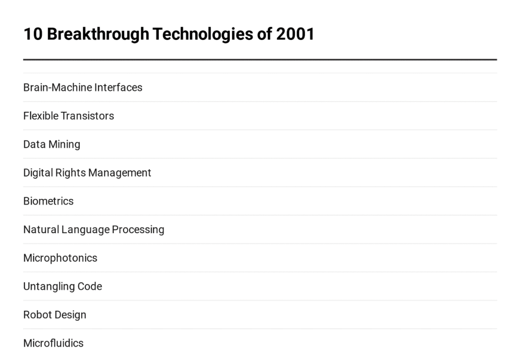 우선 생각보다 꽤 괜찮은 목록이었다는 건 짚고 넘어가고 싶다. 우린 인간복제, 외골격 로봇, 나노 제조업 및 그레이 구(gray goo) 시나리오 등을 모두 배제했었다. 당시에 굉장히 큰 관심을 끈 주제들이었음에도 말이다. 그 대신 정보통신, 재료공학, 생명공학 등의 분야에서의 보다 근본적인 발전들에 초점을 맞췄다. 당시에 막 발아했던 그 기술들(데이터 마이닝, 자연어 처리, 미세유체공학, 뇌-기계 인터페이스, 바이오메트릭스, 로봇 디자인)은 오늘날에도 화제의 중심에 서 있다.