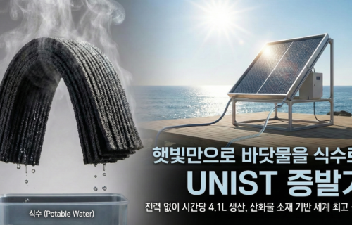 UNIST, 햇빛만으로 바닷물을 식수로 바꾸는 증발기 개발 전력 없이 태양광만으로 바닷물을 가열해 식수로 만드는 고성능 증발기가 개발됐다. 1m² 크기로 시간당 4.1L 식수를 생산하며, 산화물 소재 기반 장치 중 세계 최고 수준이다.