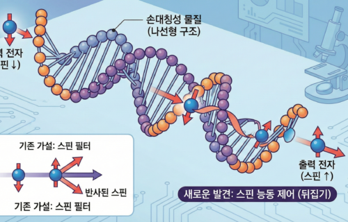 UNIST, DNA처럼 꼬인 물질이 전자 스핀 뒤집는다 손대칭성 물질이 특정 스핀만 걸러낸다는 기존 가설을 뒤집었다. 물질이 전자 스핀을 직접 바꾼다는 사실을 실험으로 입증해 스핀트로닉스 소자 설계에 새 길을 열었다.