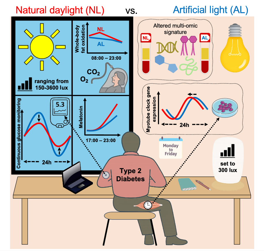 연구진은 제2형 당뇨병 환자 13명을 대상으로 자연광과 인공조명 환경에서 각각 5일간 생활하게 한 결과, 자연광을 쬔 기간에는 혈당이 정상 범위에 머무는 시간이 늘어나고 변동성이 감소했으며, 지방 연소가 증가하는 등 대사 기능이 개선됐다. 이는 자연광이 당뇨병 환자에게 측정 가능한 대사적 이점을 제공한다는 첫 번째 통제된 실험 증거다. 이번 연구는 국제 학술지 ‘Cell Metabolism’ 온라인에 1월 6일 게재됐다.