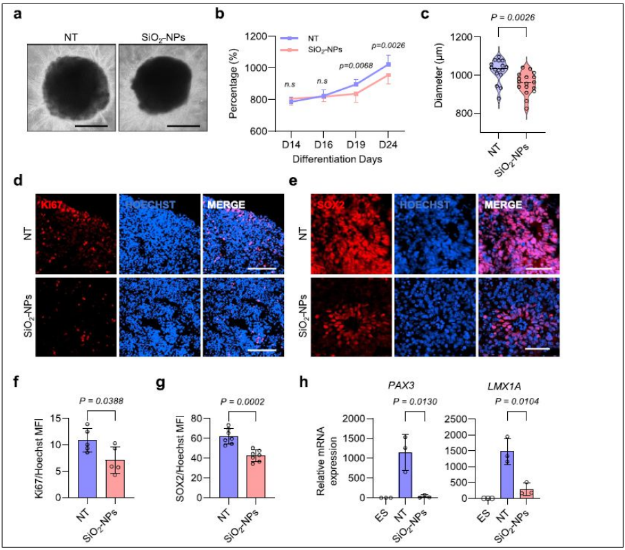 연구팀은 인간 다능성 줄기세포(hPSC)로부터 도파민 신경계가 형성되는 중뇌 오가노이드를 제작하고, 신경발달 초기 단계에서 실리카 나노입자에 노출시켜 그 영향을 분석했다.