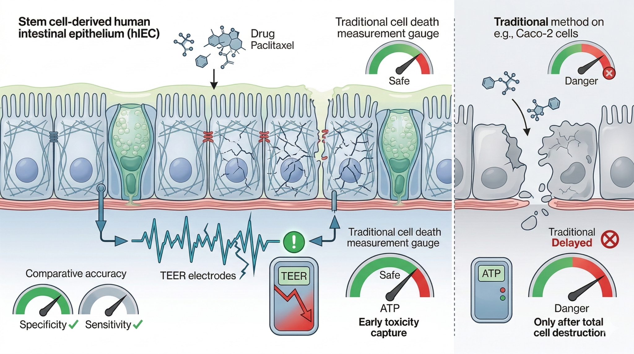 더 큰 문제는 기존 평가법의 측정 방식 자체에 있었다. 대부분의 독성 평가는 ATP(세포 에너지원) 측정을 통해 세포 생존 여부를 확인하는 방식에 의존했다. 이 방법은 세포가 완전히 죽어야 이상 신호를 포착할 수 있어, 세포는 살아 있지만 장벽 기능이 이미 무너지고 있는 ‘초기 독성 신호’를 놓칠 수밖에 없었다.