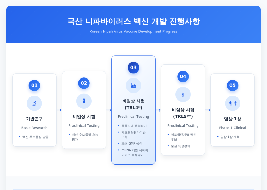 질병관리청이 제시한 개발 로드맵은 크게 다섯 단계로 구성된다. 기반연구(2022~2023년)와 기초 비임상시험(2024~2026년)을 거쳐, 올해부터는 TRL4 단계 비임상시험으로 동물모델 효력평가와 재조합 단백질 기반 GMP 생산을 추진한다. mRNA 기반 니파바이러스 안전성 평가는 2026~2027년에 걸쳐 진행될 예정이다. TRL(Technology Readiness Level)은 기술 성숙도를 나타내는 지표로, TRL4는 실험실 수준의 생체 내 안전성과 유효성을 확보하는 단계를 의미한다.