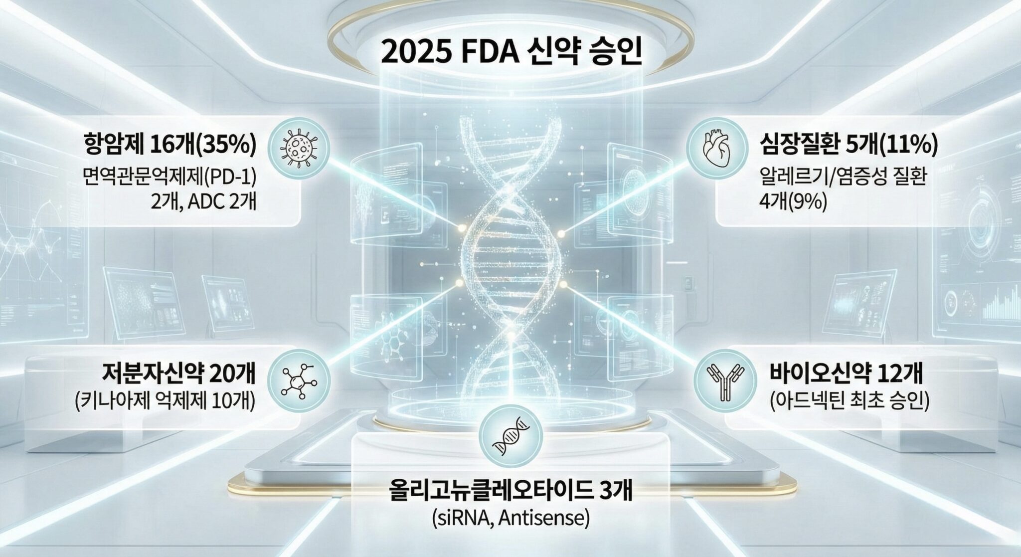 저분자신약 31개 중에는 일반 저분자 20개, 키나아제 억제제 10개, 펩타이드성 저분자 1개가 포함됐다. 키나아제 억제제가 특히 눈에 띈다. 키나아제는 세포 내에서 신호를 전달하는 효소인데, 암세포에서는 이것이 비정상적으로 활성화되어 암세포 성장을 촉진한다. 키나아제 억제제는 이 효소를 차단해 암세포 성장을 억제하는 약물이다. 새로 승인된 저분자신약의 약 3분의 1을 키나아제 억제제가 차지한 것은 역대 최대 규모다.