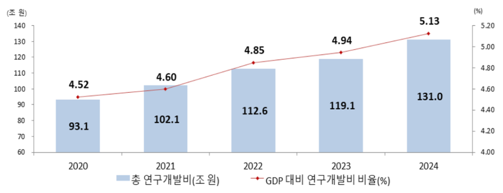 한국의 R&D 투자가 GDP의 5%를 넘어섰다는 것은 분명 성취다. 하지만 민간 주도의 단기 성과 중심 투자 구조가 장기적으로 지속 가능한지, 기초연구와 공공 부문에 대한 투자 축소가 미래 혁신 역량을 약화시키지 않을지는 면밀히 살펴봐야 할 문제다.