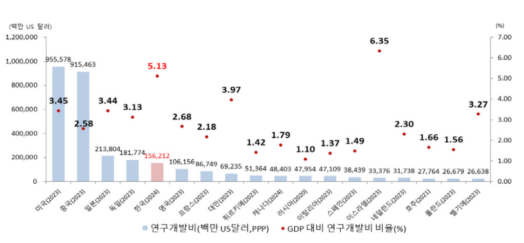 한국의 GDP 대비 R&D 투자 비중 5.13%는 단순한 숫자 이상의 의미를 지닌다. OECD 회원국 중 이스라엘을 제외하고 5%를 넘는 나라가 없다는 점에서 한국의 혁신 투자 강도는 세계 최고 수준이다.