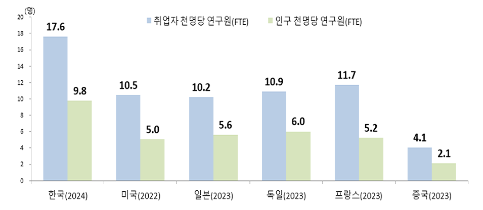 한국의 취업자 1,000명당 연구원 수는 17.6명으로 세계 1위다. 인구 1,000명당 연구원 수(9.8명)도 마찬가지다. 총 연구원 수는 61만 5,063명으로 전년 대비 1.9% 증가했다.