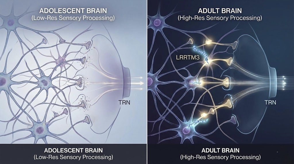 연구팀은 생쥐 모델의 발달 단계를 정밀 분석하여, 청소년기에서 성인기로 이행되는 과정에서 시상망상핵(TRN) 회로가 재구성을 거친다는 사실을 확인했다. 특히 시냅스 접착단백질 ‘LRRTM3’가 뇌가 성인용 고해상도 감각 인지 모드로 전환하도록 돕는 핵심 분자임을 밝혀냈다. 이번 연구는 뇌 회로의 성숙이 청소년기를 넘어 성인기까지 이어진다는 새로운 패러다임을 제시했으며, 2월 18일 뇌과학 전문학술지 《뉴런》에 온라인 게재됐다.