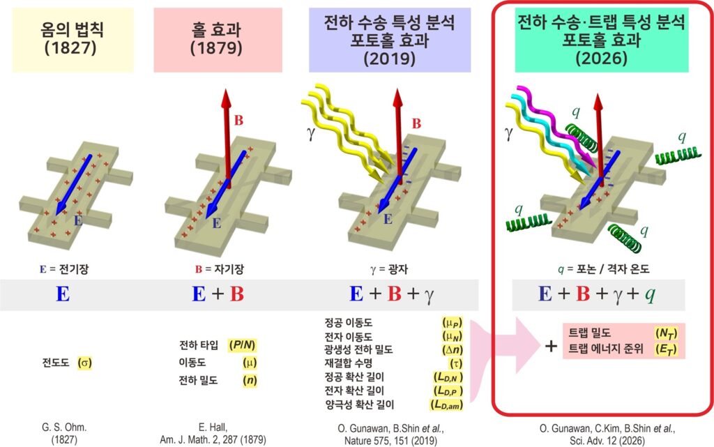 반도체 내부에 숨어 있는 미세한 결함을 기존보다 약 1,000배 더 민감하게 찾아낼 수 있는 분석 기술이 개발됐다. KAIST(총장 이광형) 신소재공학과 신병하 교수와 IBM T.J. Watson 연구소의 오키 구나완(Oki Gunawan) 박사 공동 연구팀은 8일, 반도체 내부에서 전기 흐름을 방해하는 결함(전자 트랩, 전자를 먼저 붙잡아 이동을 막는 반도체 내부 결함)과 전자의 이동 특성을 동시에 분석할 수 있는 새로운 측정 기법을 개발했다고 밝혔다. 연구팀은 오래전부터 사용된 Hall 측정(전기와 자기장을 이용해 전자의 움직임을 분석하는 방법)에 빛을 비추고 온도를 바꿔가며 측정하는 방식을 더해, 기존 방법으로는 확인하기 어려웠던 미세한 전자 트랩까지 찾아냈다. 이 기법을 실리콘 반도체와 차세대 태양전지 소재인 할라이드 페로브스카이트 박막에 적용한 결과, 기존 정전용량 기반 분석법으로는 검출하기 어려웠던 낮은 결함 밀도까지도 분석이 가능함을 확인했다. 연구 결과는 국제 학술지 ‘Science Advances’ 1월 1일자에 게재됐다.