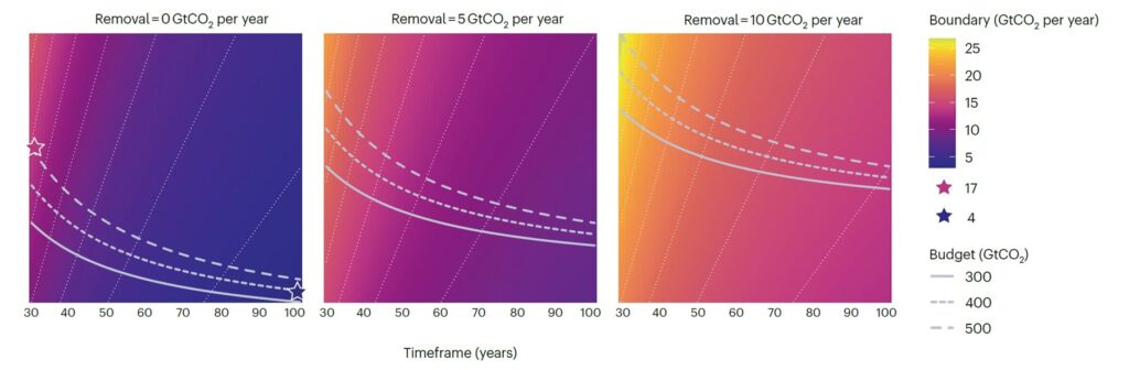 연구팀은 질소·인 오염 평가에 쓰이는 것과 동일한 ‘연간 배출량’ 기준을 탄소에도 적용했다. 구체적으로는 지구 평균 온도 상승을 1.5°C 이내로 제한한다는 목표에 맞춰, 남아 있는 전 지구 ‘탄소 예산(Carbon Budget, 온도 목표를 지키기 위해 앞으로 배출할 수 있는 CO₂의 총 허용량)’과 미래에 기술적으로 제거 가능한 탄소량을 함께 고려해 안전한 연간 배출 범위를 산출했다.