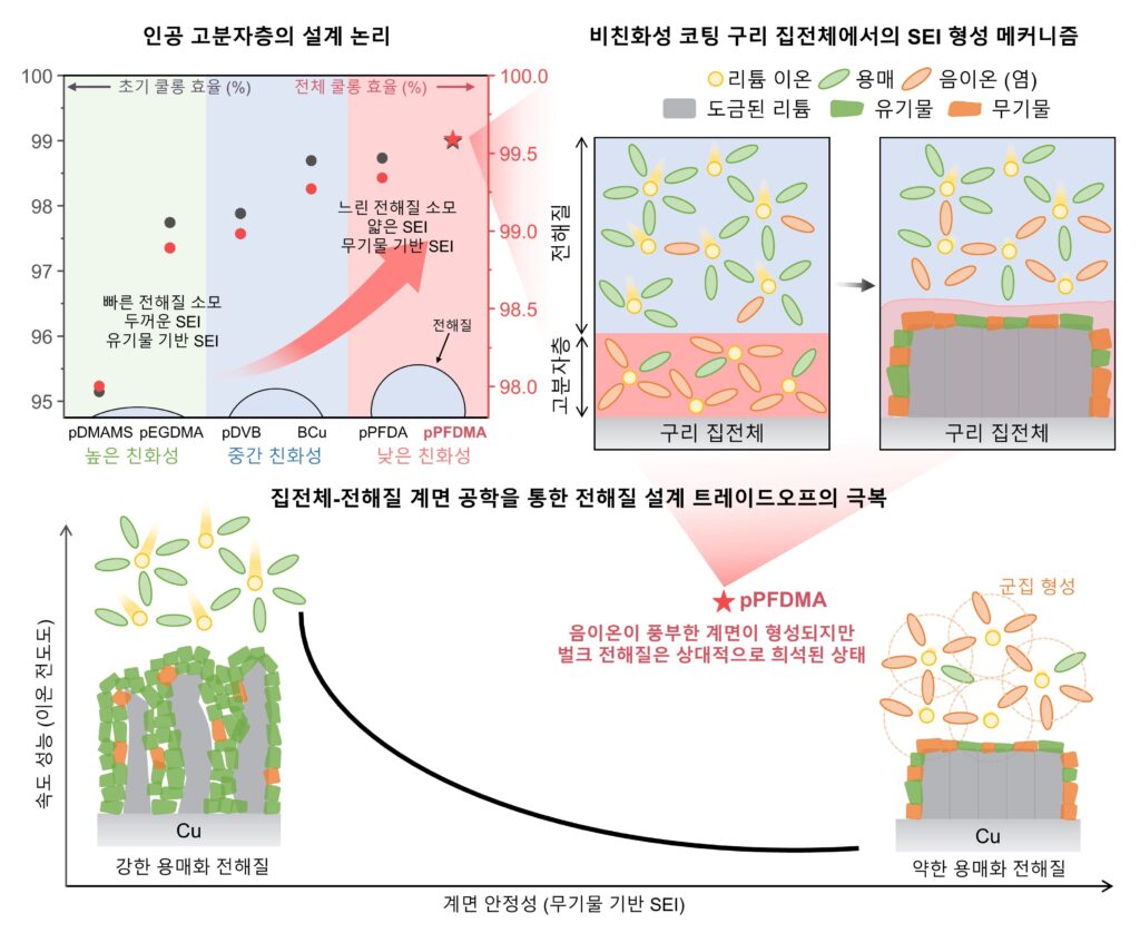 이 현상의 핵심 원인으로 지목돼 온 것이 SEI(Solid Electrolyte Interphase, 고체 전해질 계면)다. SEI는 전해질이 분해되며 전극 표면에 형성되는 보호막으로, 구조와 조성이 불균일할 경우 리튬 증착을 불안정하게 만든다. 기존 연구들은 전해질 조성을 바꾸는 방식으로 SEI를 제어하려 했지만, 이는 배터리 전체 반응계에 영향을 주어 예측하기 어려운 부작용을 동반할 수 있었다.