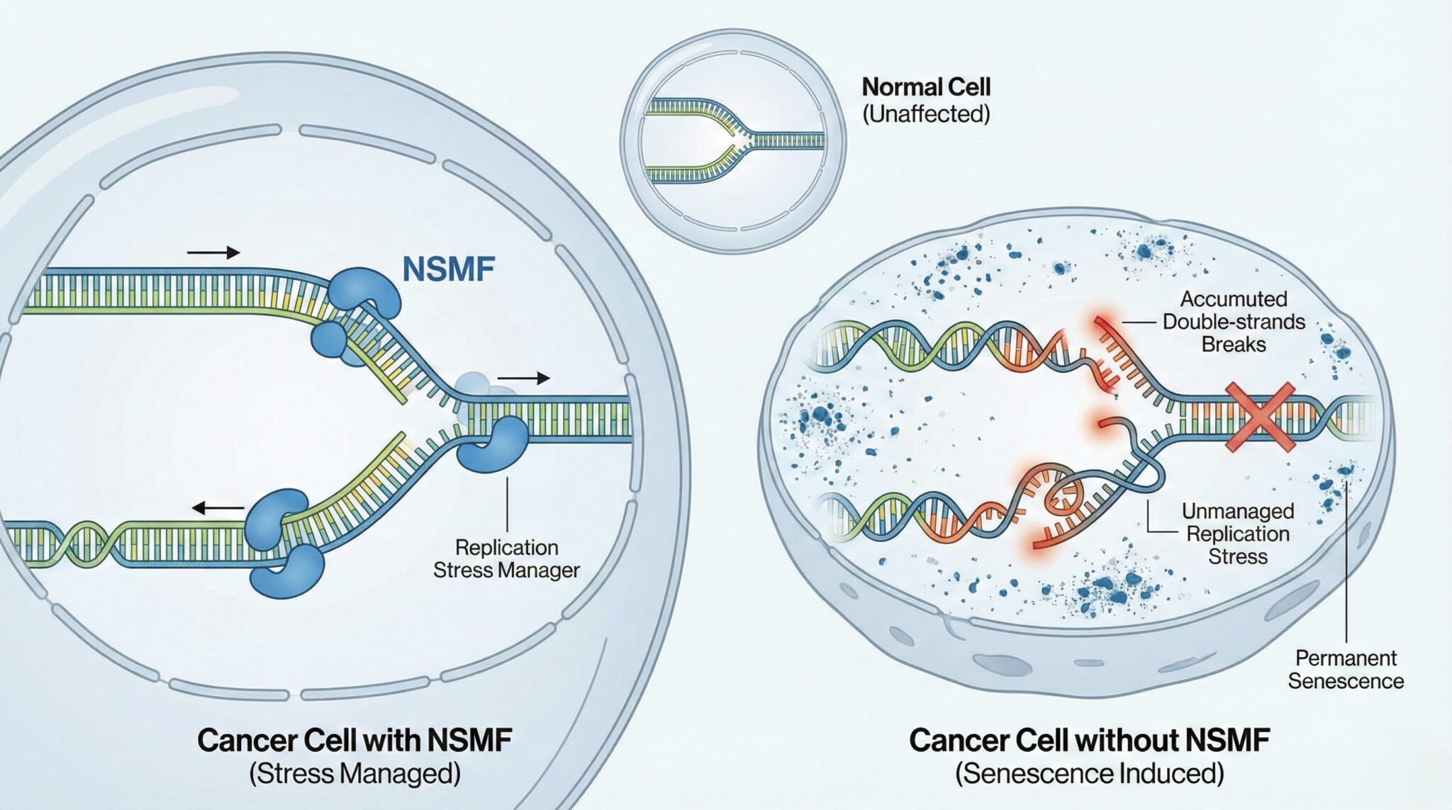 암세포의 복제 스트레스 관리자 NSMF는 암세포 증식과정에 복제 스트레스를 ‘임계값(Threshold of excessive stress)’ 이내로 유지하도록 조절함으로써 암세포가 치명적인 DNA 손상과 노화를 피하면서도 성장에 유리한 유전적 불안정성을 확보할 수 있게 돕는다.