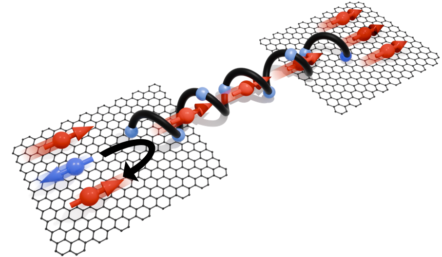 꼬여진 방향에 따라 자성을 띄는 스핀 전류가 흐르게 되는 원리를 나타내는 모식도.