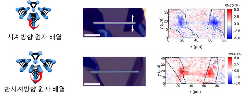텔레륨 나노선 물질 양쪽에 그래핀 전극을 붙인 소자의 실제 광학 이미지(우측) 자기 원형 이색성(RMCD)으로 측정한 스핀 분포 지도.