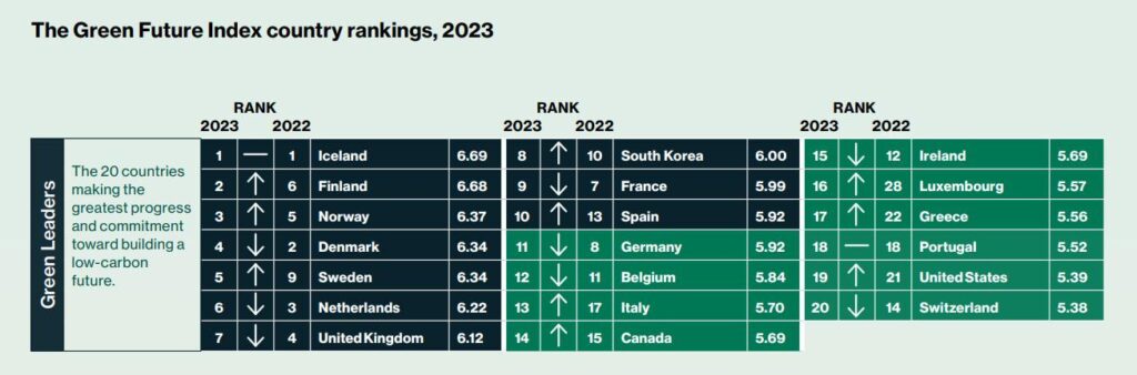 MIT 테크놀로지 리뷰에서 발표하는 녹색 미래 지수(The Green Future Index, GFI) 2023이 지속 가능한 저탄소 개발 능력 점수에 따른 국가 순위를 공개했다. 해당 지수는 전 세계 76개국(전 세계 GDP의 90% 차지)을 대상으로 한다. 점수 지표는 탄소 배출량, 에너지 전환, 그린 소사이어티, 청정 혁신, 기후 정책 5가지 항목이다. 이중 에너지 전환과 기후 정책은 녹색 미래 지수 2022 발표 이후, 각국의 탈탄소화 진행 상황을 파악할 수 있는 지표로 추가되었다. 에너지 전환은 최신 재생에너지 데이터를 사용해 국가의 에너지 시스템의 지속가능성을 더욱 정확하게 측정하며, 기후 정책은 코로나19 프로그램 감소와 친환경 공공 지출 프로그램 증가에 따른 지표의 변화를 반영했다. 위의 5가지 지표를 통합한 전체 순위를 보면 3년째 아이슬란드가 1위를 유지하고 있으며 2위는 핀란드, 3위는 노르웨이, 4위는 덴마크, 5위는 스웨덴 순이다.