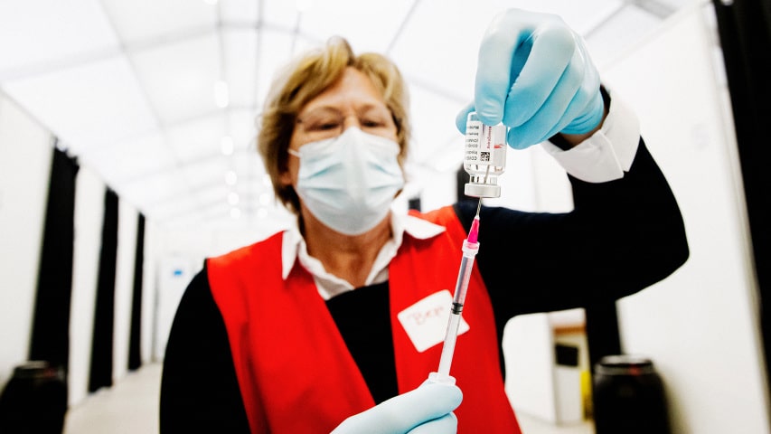 2021년 5월 1일, 네덜란드 헤이그의 아도 경기장(ADO stadion)에 위치한 백신 접종 센터. 여기서 사람들은 화이자와 아스트라제네카 백신을 접종받는다.