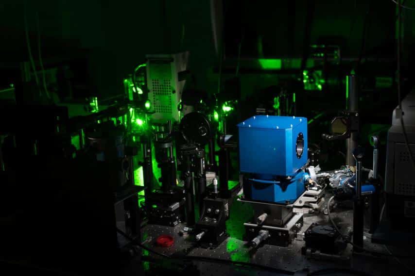 (사진설명) 다이아몬드 앤빌셀(파란 박스)과 레이저 어레이를 갖춘 상온 초전도체 생성 장비. 로체스터 대학교 랭거 디아스(Ranga Dias) 교수 실험실에서 촬영.