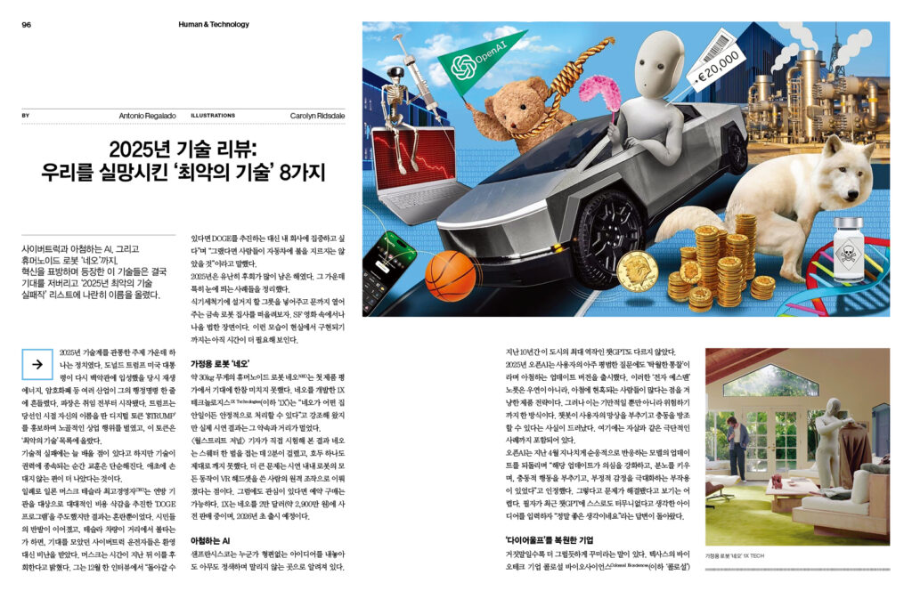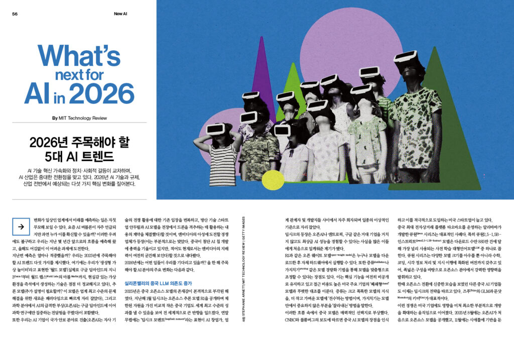 New AI에서는 2026년 주목해야 할 5대 AI 트렌드를 비롯해 LLM의 성능을 좌우하는 핵심 단위인 ‘파라미터’의 의미, 엔비디아가 강조하는 ‘AI 팩토리’ 전략을 해설한다. 또한 LG AI연구원 이홍락 원장 인터뷰를 통해 다음 단계로 떠오르는 ‘사이언티스트 AI(가설?실험?검증)’의 가능성과 산업 전환의 방향을 조망한다. Human & Technology에서는 샘 올트먼의 발언을 둘러싼 논쟁, 데이터센터가 지역 사회에서 혐오시설로 인식되는 배경, AI가 선거 판도에 미칠 영향, ‘AI 버블’이 세계 경제에 던지는 함의, 2025년 최악의 기술 실패 사례까지 기술의 사회적 파장과 경계선을 함께 점검한다. 그 외 면역 점수화, 유전자편집, 비만 치료제 논쟁, 탄소 제거 산업의 위험과 전망, 동남아 우주 산업의 부상 등 기술이 바꾸는 생명·기후·우주 산업의 최전선을 따라간다.