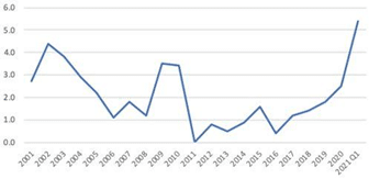연간 노동생산성 증가율, 2001년~2021년 1분기