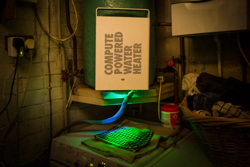 보일러 옆에 놓인 컴퓨터에는 “이 강력한 컴퓨터 서버는 처리 과정의 발열을 실린더 내부의 물로 전달합니다”라는 문구가 적힌 스티커가 붙어있다. 조던은 녹색 LED가 점등되면 보일러가 작동 중이라는 뜻이라고 설명하며 “이 컴퓨터는 데이터를 받아 처리하는 과정에서 우리는 일반 가구의 일일 사용량에 해당하는 소비 전력 4.8kWh 상당의 온수를 전달할 수 있다”고 덧붙였다.