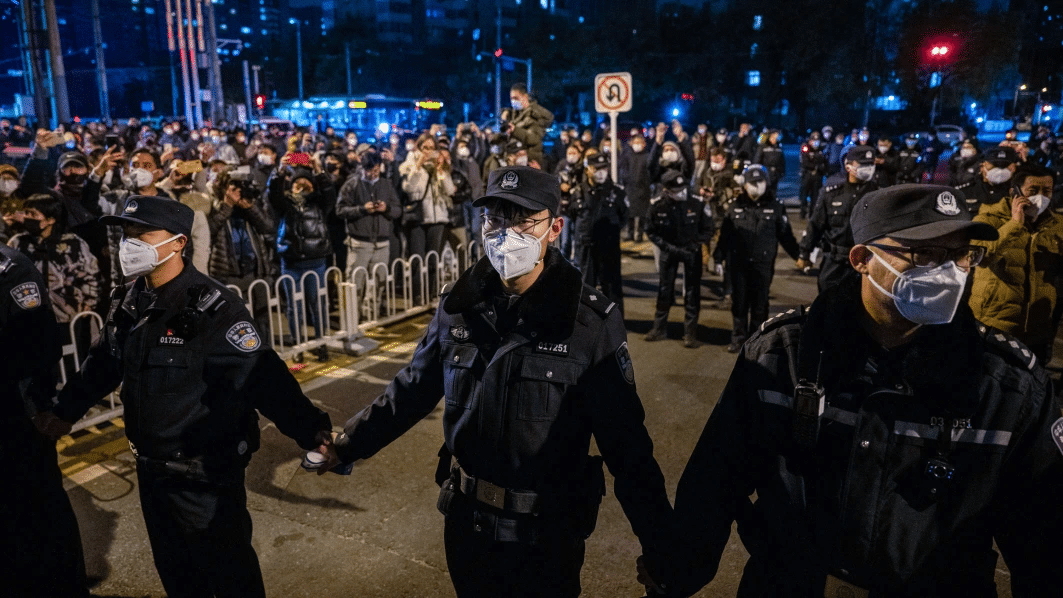 중국에서 벌어진 코로나19 봉쇄 2022년 11월 27일 중국 베이징에서 일어난 제로 코로나 반대 시위에서 공안이 저지선을 구축하고 있다.